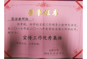 英语教研组获宣传工作优秀集体 作者: 来源: 发布时间:2018-11-26 浏览次数: 次 【字体:小 大】 10月16 日长郡中学举行宣传工作总结表彰大会 。经考核,由学校宣传工作领导小组研究决定,在2017-2018年度学校宣传工作评比中,英语教研组荣获“宣传工作优秀集体“称号。 分享到: 【打印正文】