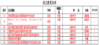 湖南省教师教育学会关于2018年度论文评审结果的通报 作者: 来源: 发布时间:2018-12-17 浏览次数: 次 【字体:小 大】 在2018年湖南省教师教育学会论文评选中,长沙市送交论文3344篇。经湖南省教师教育学会专家评审,共评出一等奖280篇,二等奖1069篇,三等奖1129篇,优秀488篇。其中,长郡中学英语教研组七位老师的成果分别荣获一二三等奖。 分享到: 【打印正文】