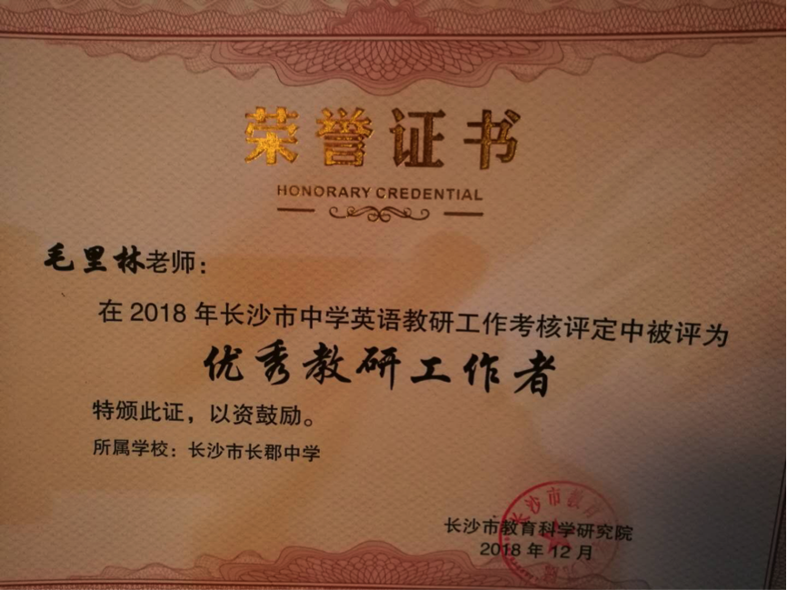 毛里林老师荣获2018年度长沙市中学英语优秀教研工作者