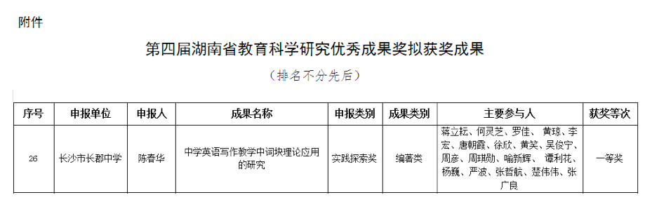 【英语】陈春华老师主研成果获第四届省教育科学研究优秀成果一等奖 作者:英语教研组 来源:英语教研组 发布时间:2019-03-25 浏览次数: 次 【字体:小 大】 日前,第四届湖南省教育科学研究优秀成果奖评审结果公示,长郡中学英语教研组陈春华老师主研成果《中学英语写作教学中词块理论应用的研究》以编著形式获实践探索类一等奖。该项成果也是陈春华老师主持的省级重点资助课题《中学英语写作教学中词块理论应用的研究》(XJK013AZXX001)结题成果之一,这是长郡中学“十二五”以来,首个获得“优秀”鉴定等级的重点资助项目。 分享到: 【打印正文】
