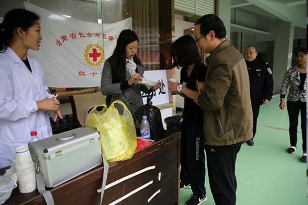2016年10月23日至24日,长郡中学校运会在贺龙体育馆隆重举行。校红十字会的成员们兴奋地戴上洁白的红十字袖章,在项目还未开始前,就守在了指定地点,等待着运动员们的到来。十几个洁白的袖章在红色的塑胶跑道上跃动着,在体育馆的每一处创造感动和温暖!