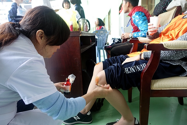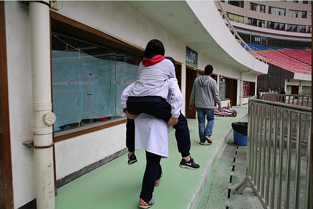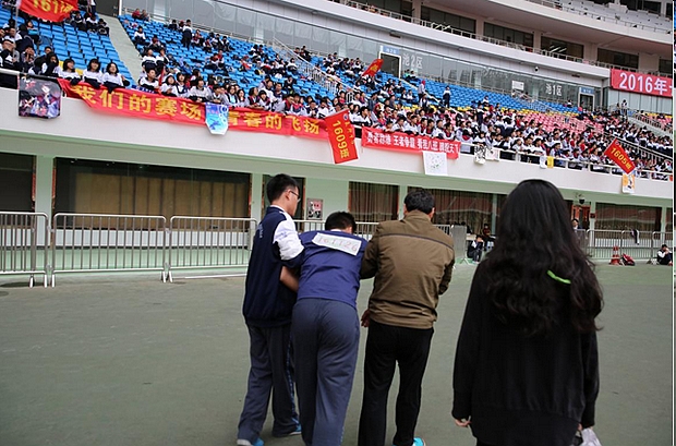 在紧张的田径项目进行时,红十字会的成员们热情地等在跑道外,小心地搀扶每一个冲到终点后有些踉跄的选手,或是亲切地告诉他们:“慢慢走一下吧,同学!”特别是几位跑步冲刺后晕倒的同学,红十字会的成员们第一时间搀扶着他们冲向医务室,医生们紧张地检查,所幸都无大碍,有的是低血糖,有的是平常缺乏运动,待受伤的同学稳定一些了,红十字会的成员们又递上一杯杯温暖的糖水,同学们感动得热泪盈眶。