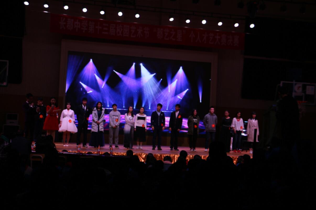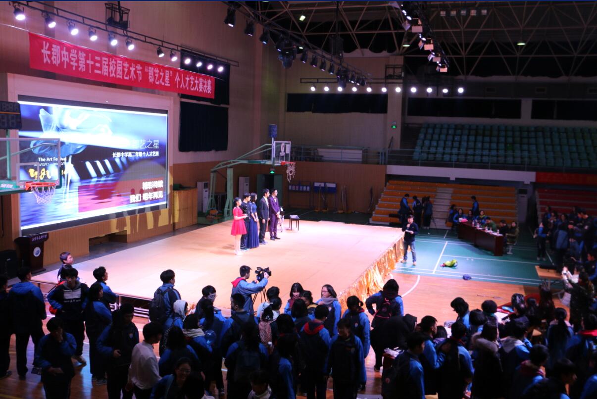 2016年12月26日下午,以“风华郡艺梦飞Young ”为主题的艺术节系列活动之“郡艺之星”——长郡中学高二年级个人才艺决赛在体育馆三楼举行。学校黎斌副校长、校团委陈溪书记、教务处肖斌武主任、高二年级组长王星老师、音乐教研组王珏老师、黄琦老师和潘晶晶老师担任此次比赛的评委。党委杜慧书记、教育处刘虹主任、校团委王剑老师等观看了整场比赛。此次比赛由校团委主办,义工大队和高二年级学生分会协办,各班同学积极报名,希望抓住这个绽放自我、超越自我的机会靠近自己的所喜所向,也为艺术节增添一抹别样的色彩。根据初赛规则,结合参赛人数,声乐组、器乐组、舞蹈组、其他组共四个组别按照评审分数高低,共有十五位同学进入决赛,展开了一场激烈的追逐。