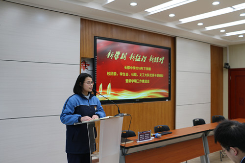 会议在庄严的校歌声中拉开帷幕。常锦老师首先对上学期的团委活动进行了全面总结,充分肯定各团队学生干部的工作态度和工作能力。接着,由王星主任宣读了2018年下学期校团委、学生会、社联、义工大队优秀干部表彰决定,并为获奖学生干部颁奖。接着,获奖代表彭嘉欣同学发表了以“如何成为一名更优秀的学生干部”为主题的讲话,从学习、工作、休闲三个角度,思考我们如何不断地提升自我,在实现个人价值的同时,助推团队成员的共同发展。