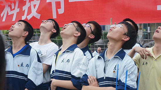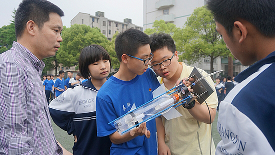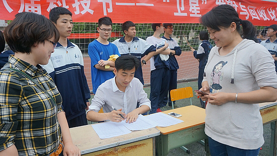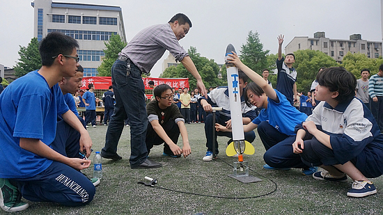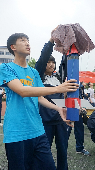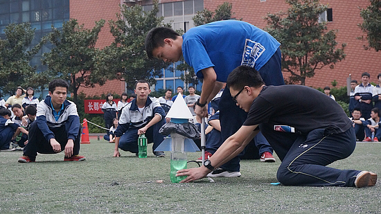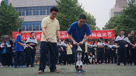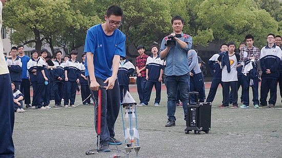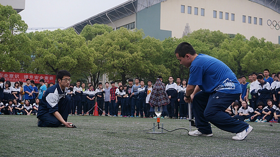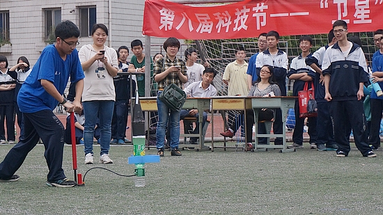 4月15日下午,高一年级在学校操场举行了自制“水火箭”发射比赛,活动现场欢呼声声。