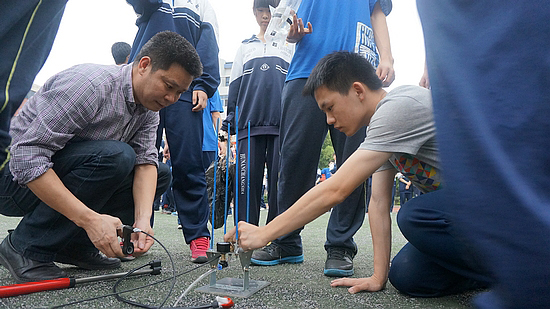 “水火箭”制作是运用物理学知识进行简单手工制作与实验的常见形式,又称气压式喷水火箭、水推进火箭等,是利用废弃的饮料瓶制作成动力舱、箭体、箭头、尾翼等,并灌入一定数量的水,利用打气筒充入空气到达一定的压力后发射。压缩的空气把水从火箭尾部的喷嘴向下高速喷出,在反作用下,水火箭快速上升,在空中飞行,像导弹一样有一个飞行轨迹,最后达到一定高度。此项活动深受学生喜爱,既提高了学生的动手实践能力,又丰富了他们的课余生活。图为活动现?。?/span>