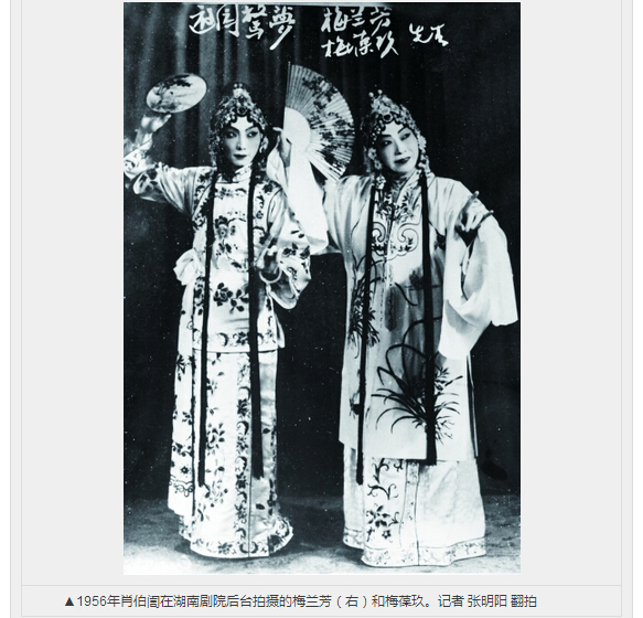 “1956年,梅兰芳在湖南剧院演出半个月,剧院经理请我为大师照相,我在后台跟他讨论亮相时如何抓拍到位,那场演的是《贵妃醉酒》,他按我告诉他的方位、眼神亮相,拍出来的效果他很满意。后来的十多天我一直跟拍,算是御用摄影师了。”