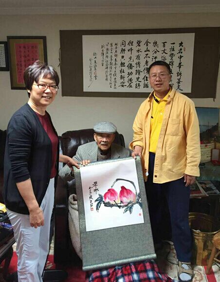钟武雄(中)在美国家中接受母校送来的礼物( 2016年暑假)