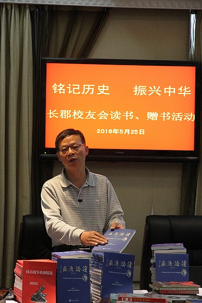 读书会由校友会秘书长江荣光主持,张坚先生做了“铭记抗战历史、振兴伟大中华”的主题演讲,他介绍道:八年抗战中,长郡四迁校址,艰难重重,但仍弦歌不辍,令人动容。他告诫学弟学妹,和平年代,大家应该居安思危,不忘国耻,努力学习,多传播正能量。