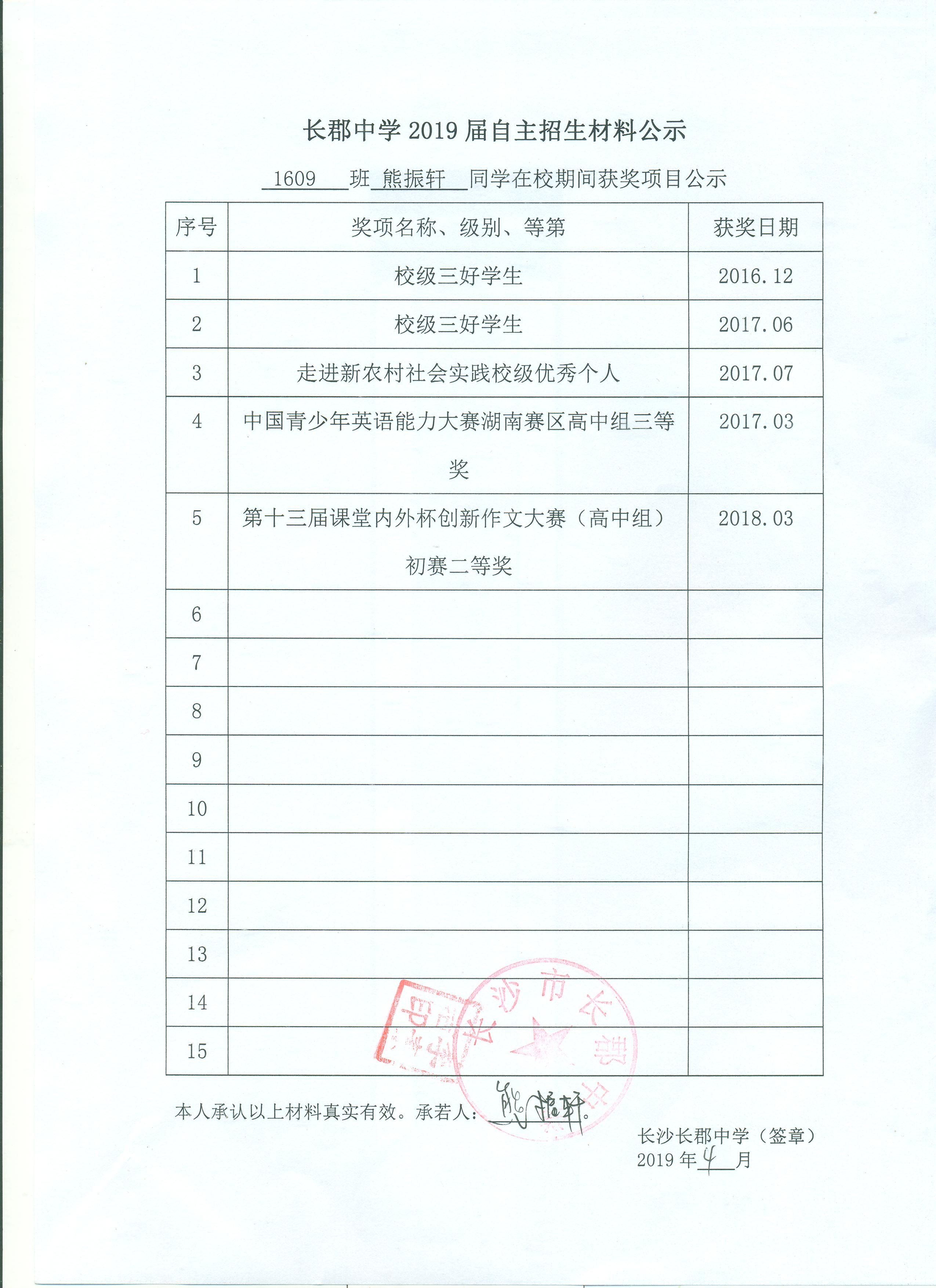 1609熊振轩自招材料网络公示