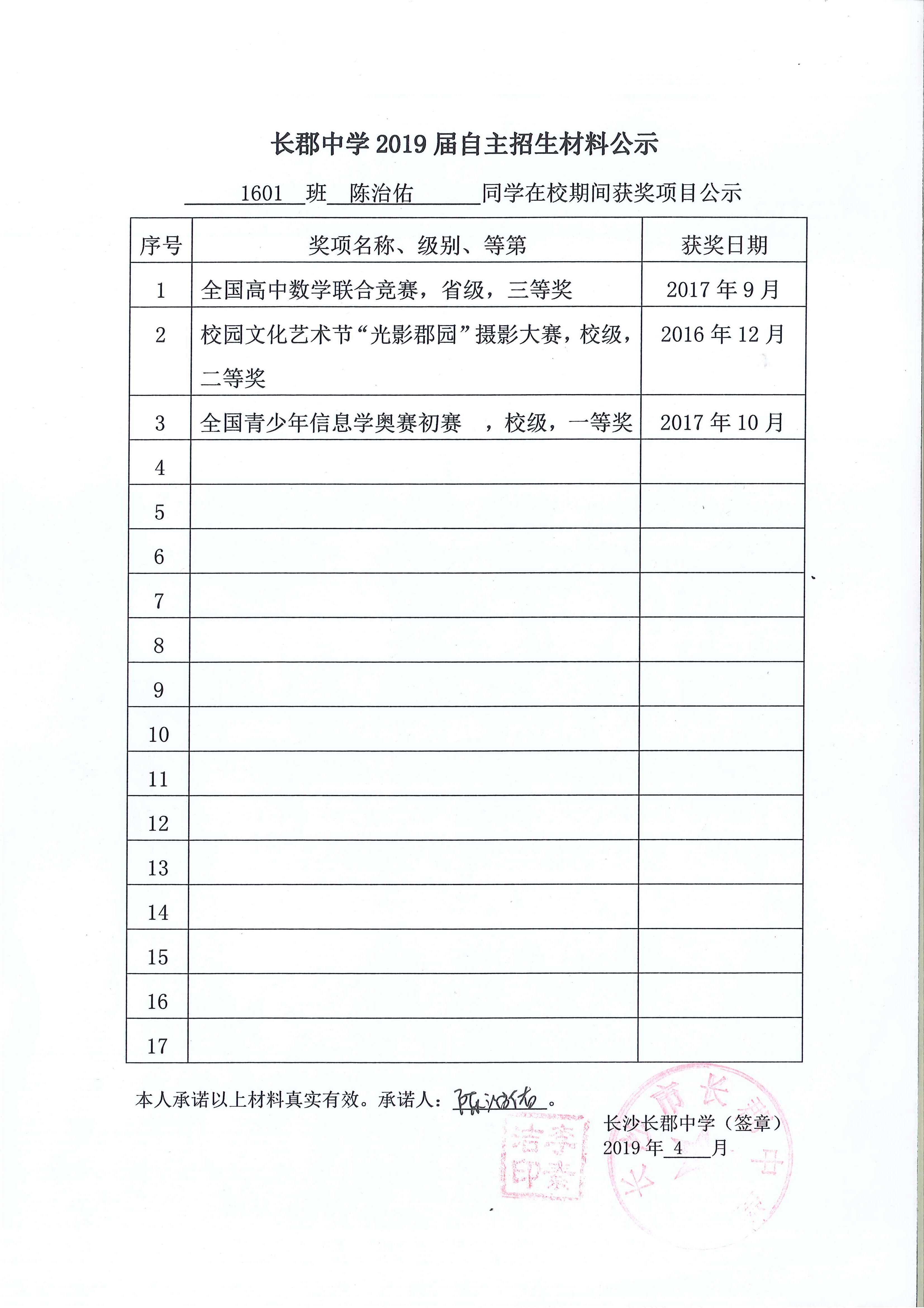 1601班陈治佑同学自招材料网络公示
