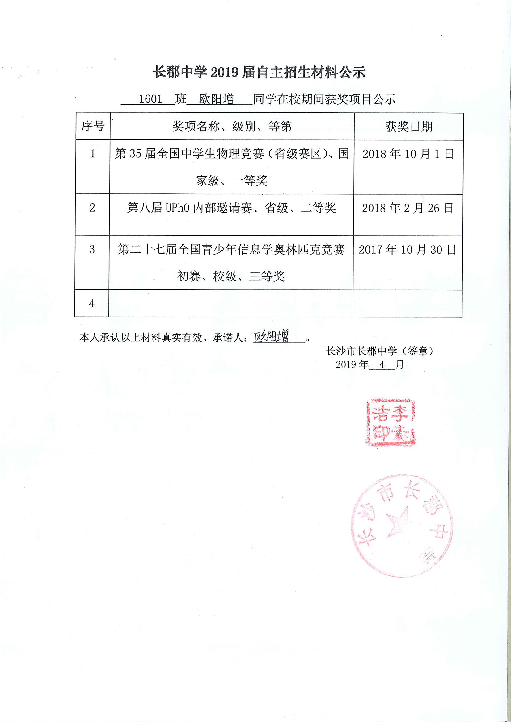 1601班欧阳增同学自招材料网络公示
