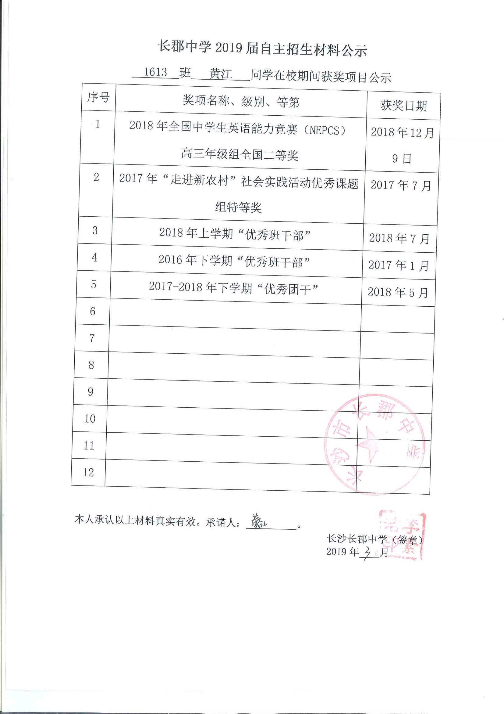 1613班黄江同学自招材料网络公示