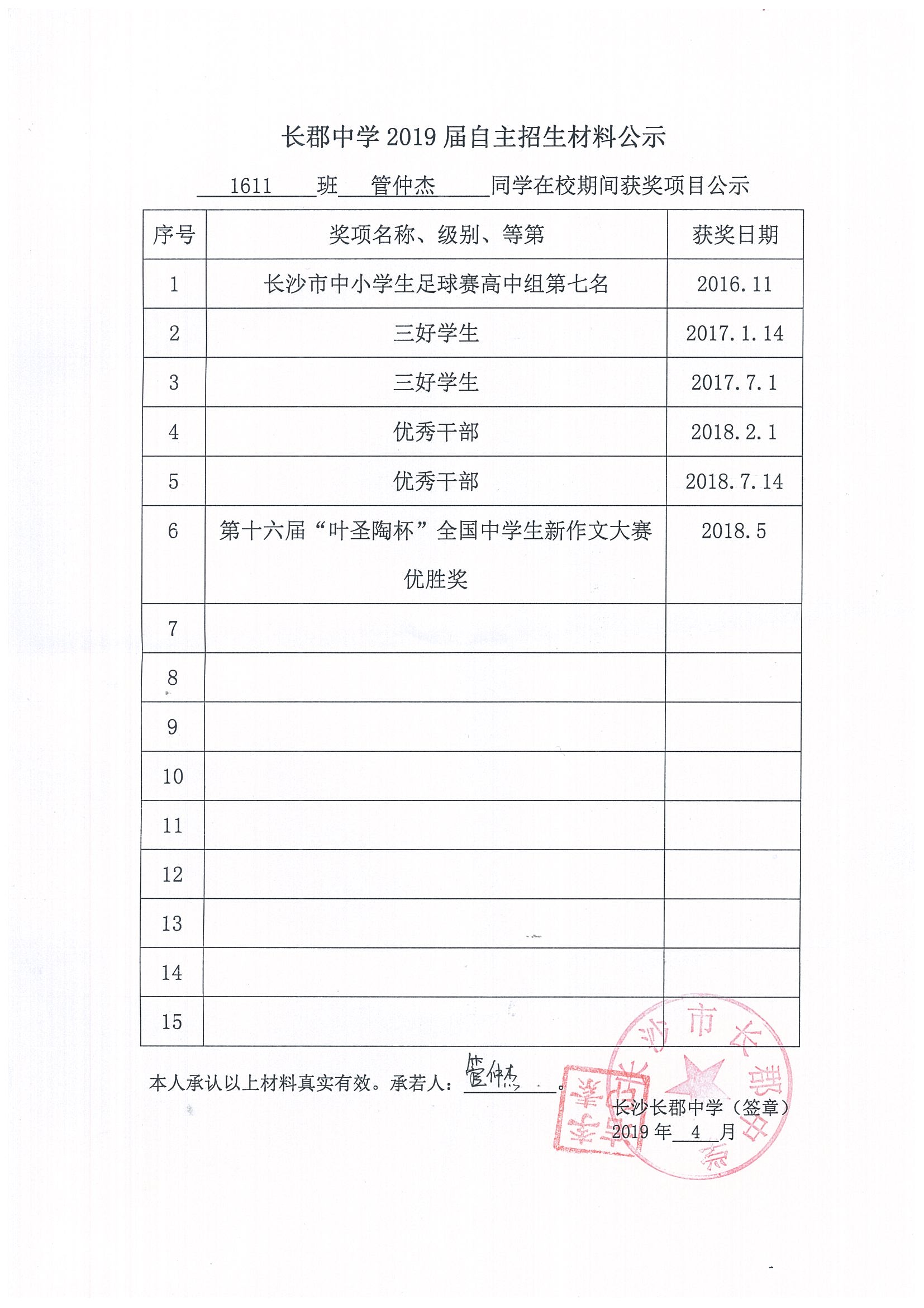 1611班管仲杰自主招生公示表