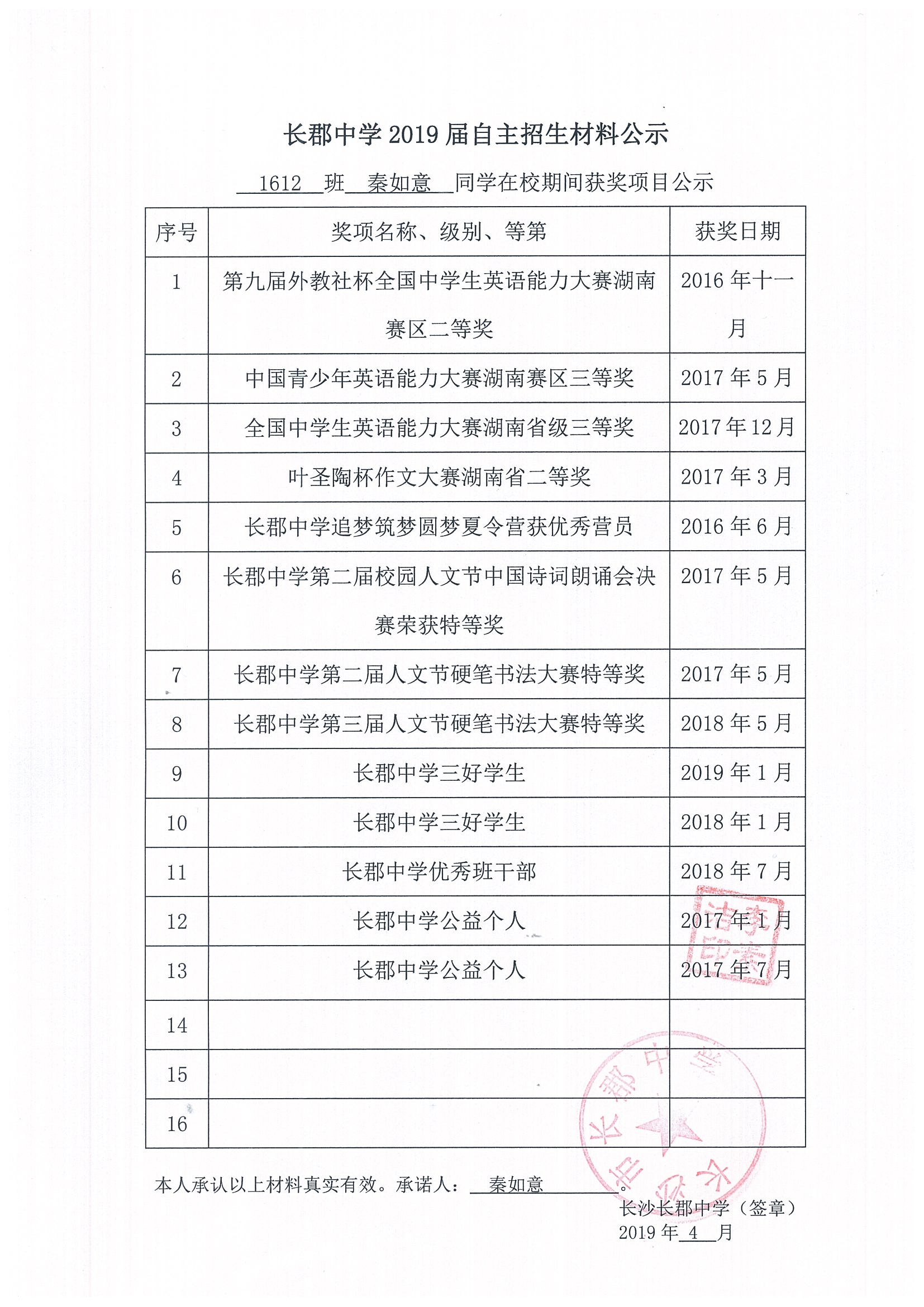 1612班秦如意自招材料网络公示