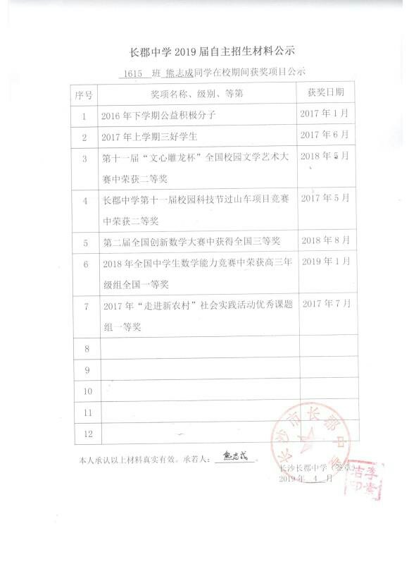 1615班熊志成同学自招材料网络公示