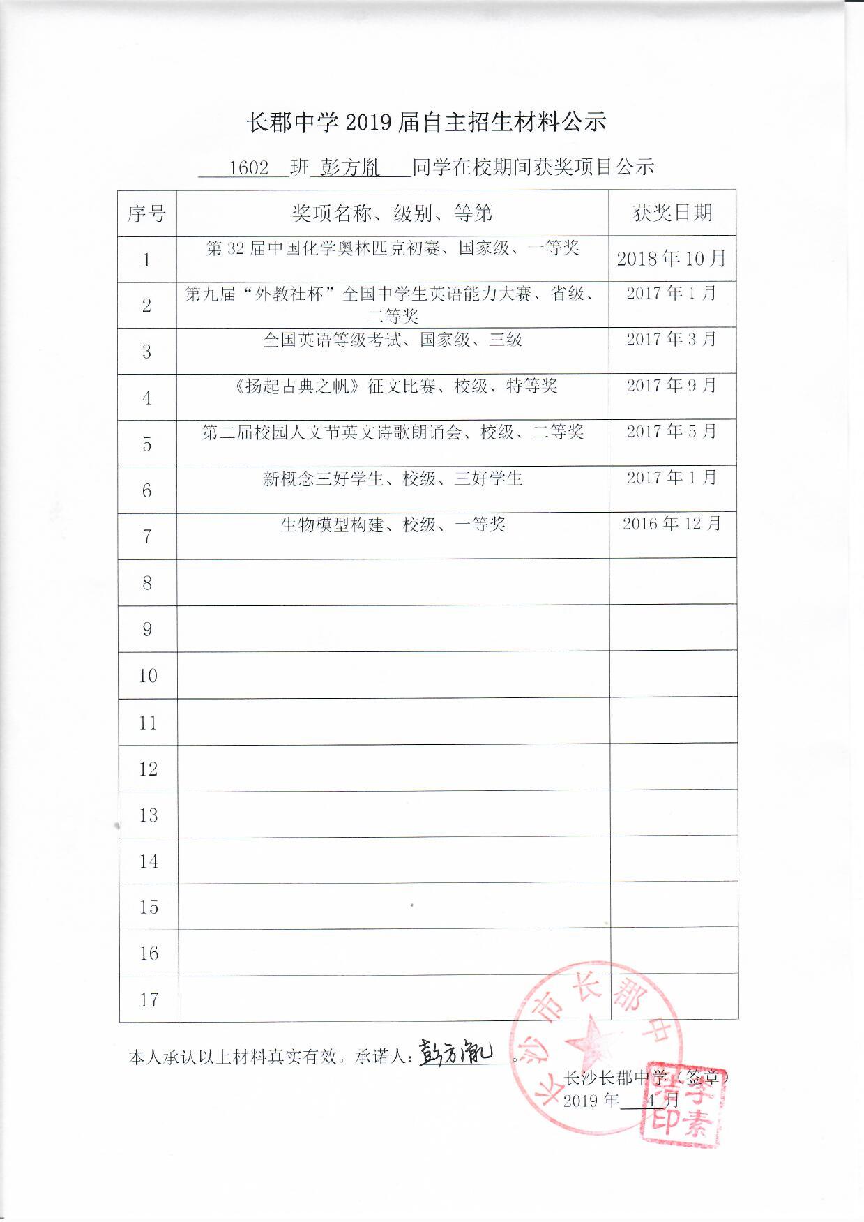 1602班彭方胤自招材料网络公示