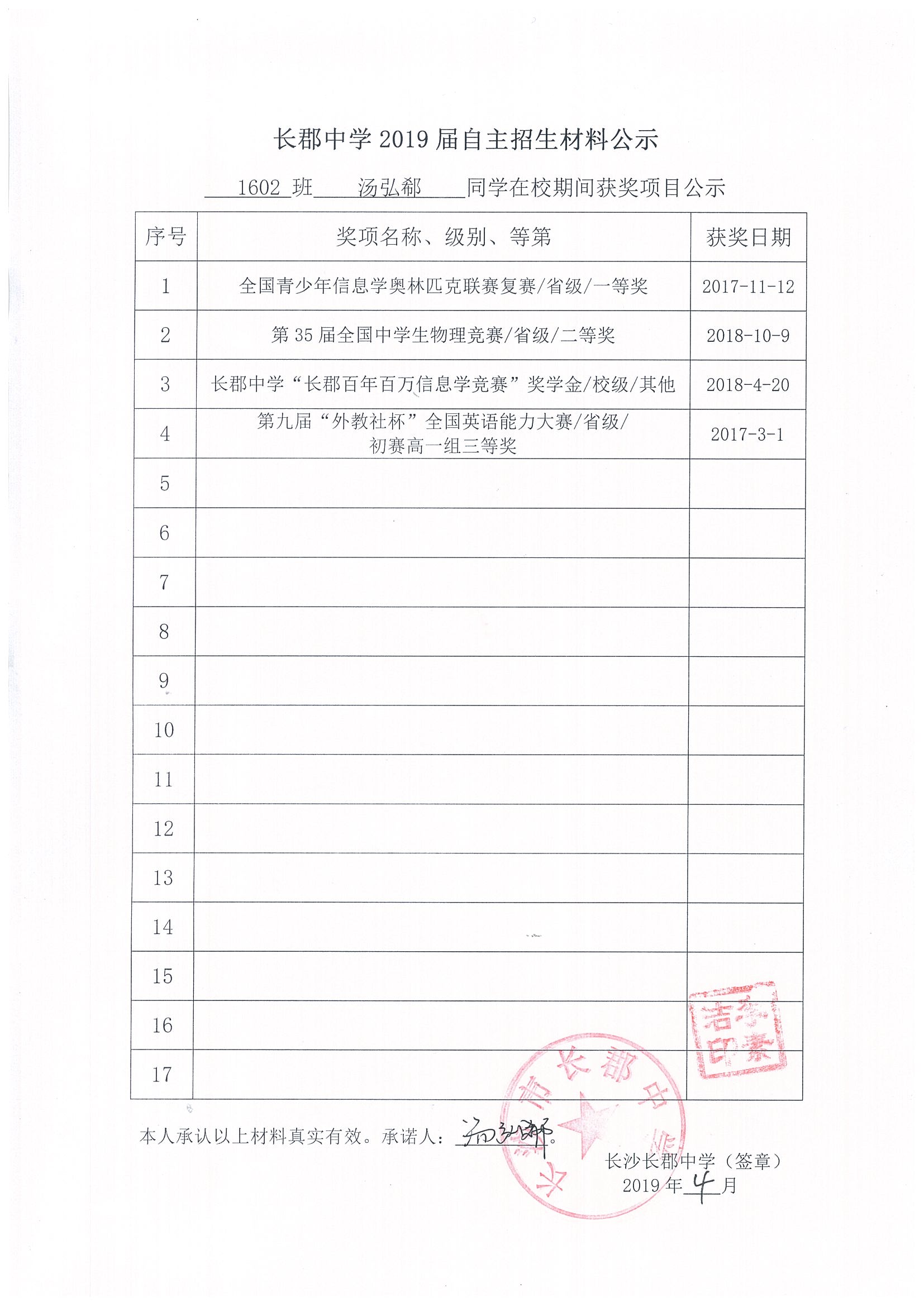 1602班汤弘郗自招材料网络公示