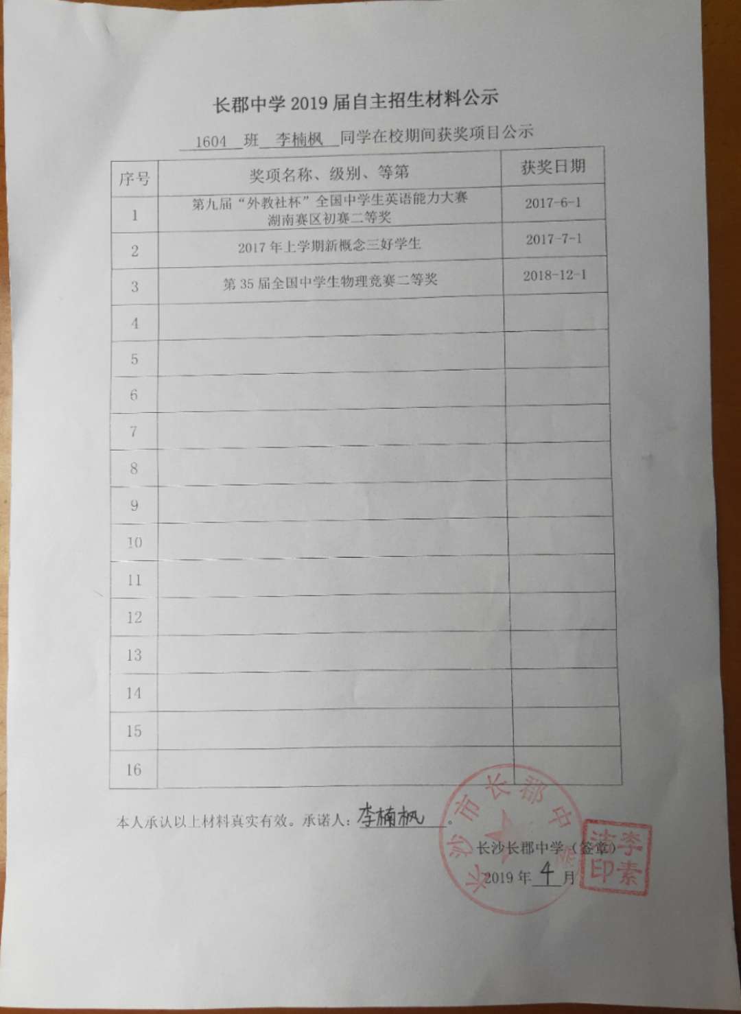 1604班李楠枫自招材料网络公示