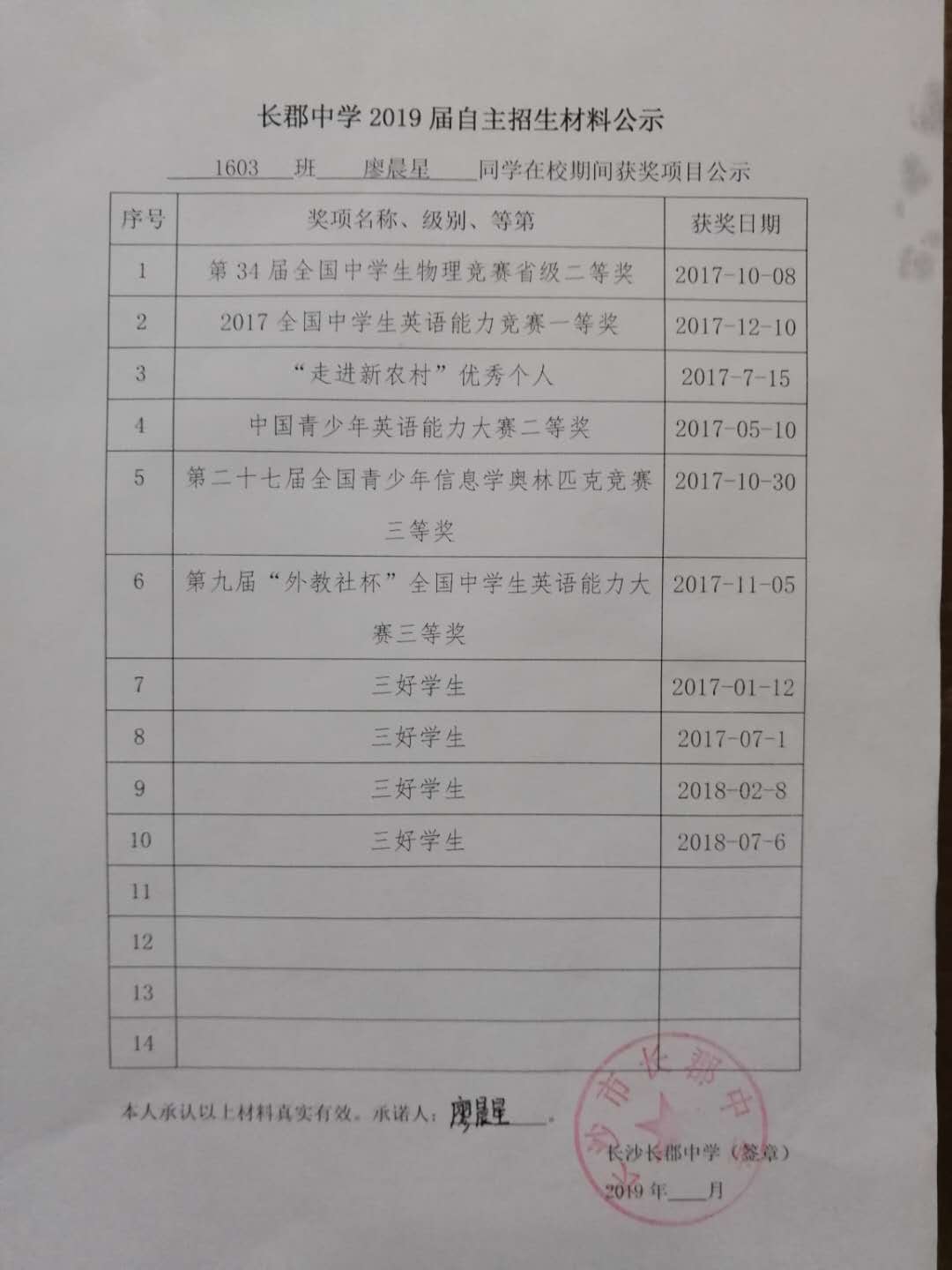 1603班廖晨星自招材料网络公示