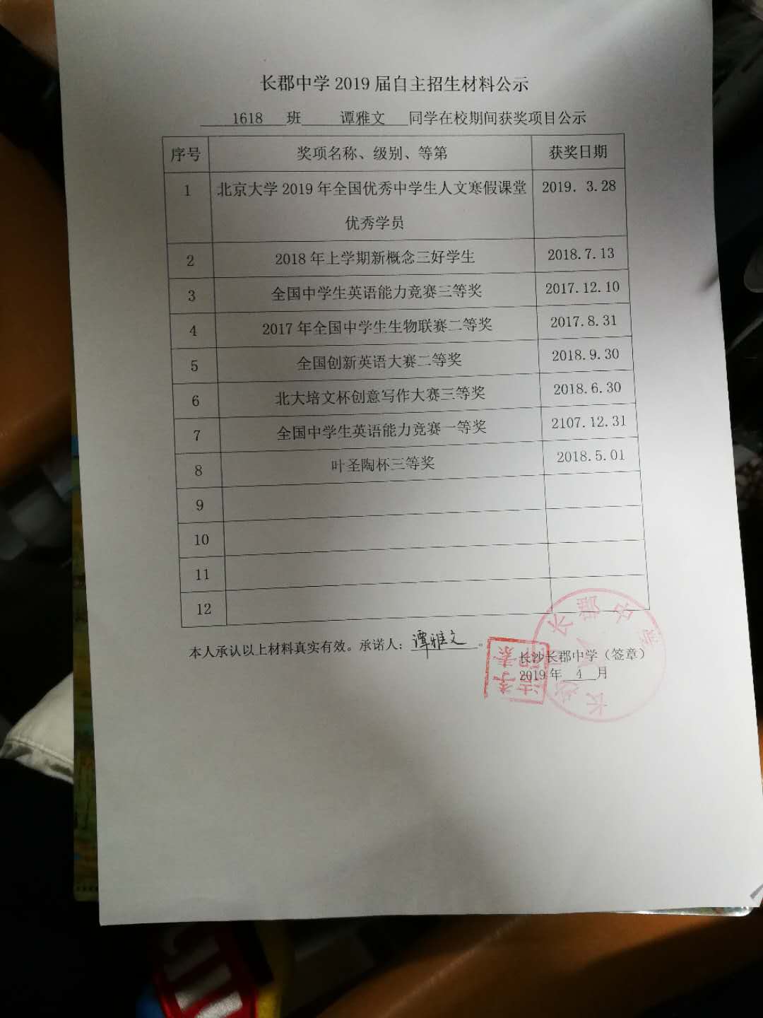 1618班谭雅文自招材料网络公示