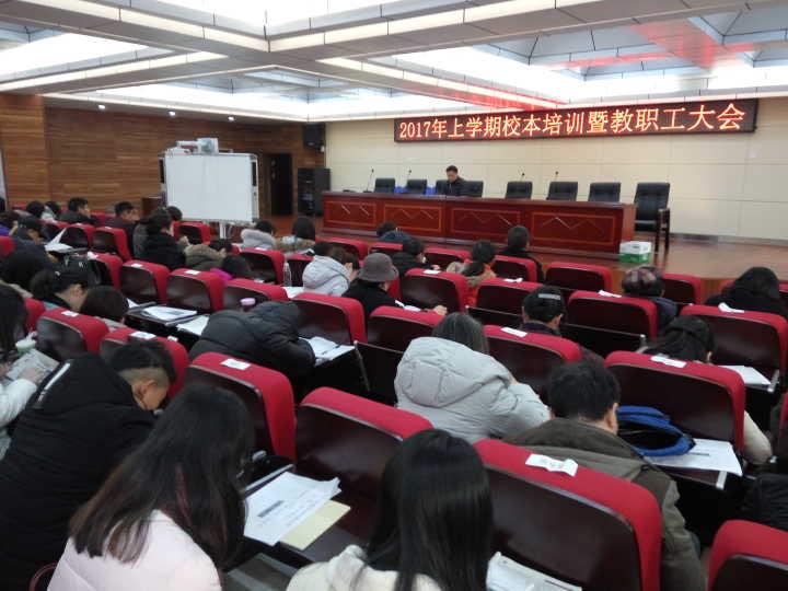 上午8:30,全体教职员工在博学楼弘毅厅召开了校本培训暨教职工大会。吴晓峰校长首先向大家表达了年后的真诚问候,随后从指导思想、本学期工作任务和主要措施和学校发展愿景等几个方面向全体老师作了2017年开学工作报告。