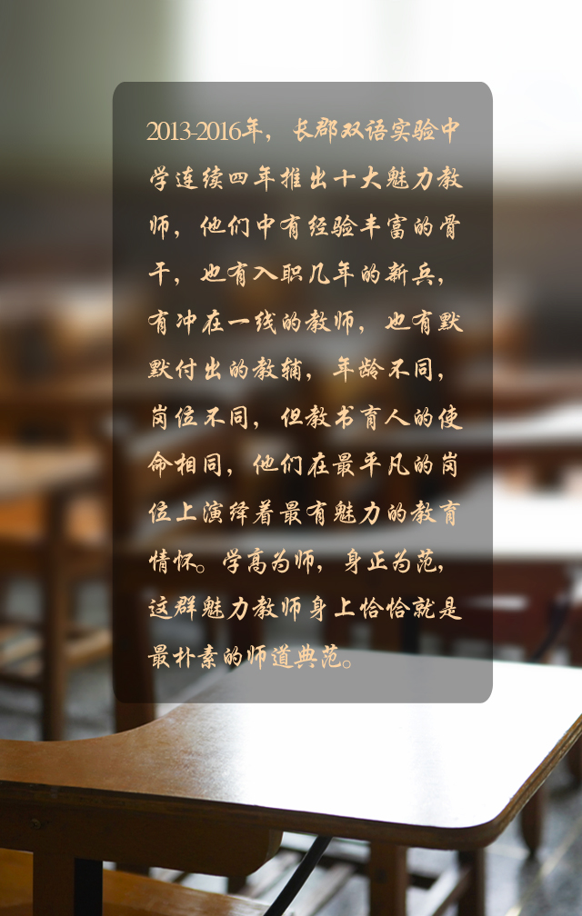 长郡双语实验中学:春风化雨,不忘初心——2016年长郡双语实验中学十大魅力教师 作者:长郡双语实验中学 来源:长郡教育集团秘书处 发布时间:2017-02-20 浏览次数: 次 【字体:小 大】 智能标签: 长郡双语实验中学;2016年十大魅力教师 相关内容 分享到: 【打印正文】
