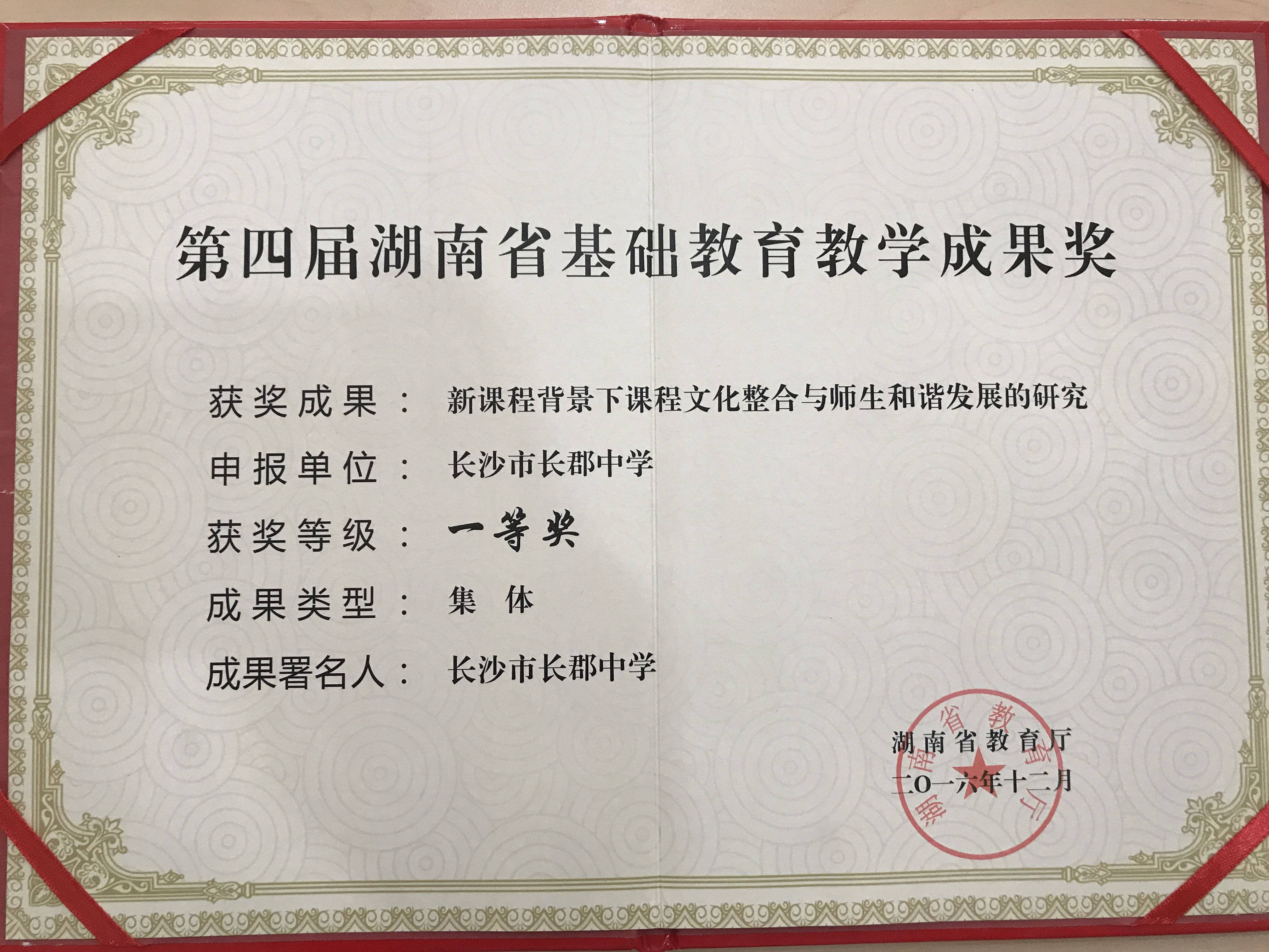长郡中学:我校荣获湖南省第四届基础教育教学成果一等奖 作者:长郡中学 来源:长郡教育集团秘书处 发布时间:2017-09-26 浏览次数: 次 【字体:小 大】 我校在第四届湖南省基础教育教学成果奖评审中荣获一等奖,这是对我校高中新课改研究基地资助课题《新课程背景下整合课程文化促进师生和谐发展的实践研究》的系列成果及其深化推广应用的肯定,更是对学校新课程改革以来整体教育教学卓越成果的高度评价。 分享到: 【打印正文】