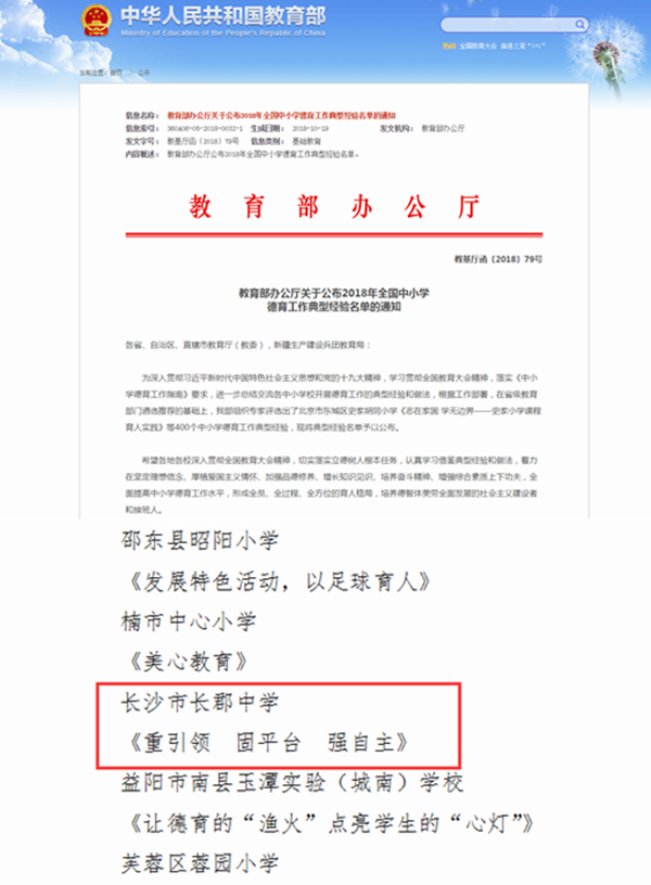 据悉,《中国德育》杂志是教育部主管、中央教育科学研究所主办的唯一的权威性德育专业刊物,被列为中央教育科学研究所核心期刊,是全国教育科学规划领导小组办公室指定的课题成果发表刊物。2018年,长郡中学的德育工作经验《重引领 固平台 强自主——长郡中学管理育人工作经验介绍》入选教育部在全国范围内评选出400个中小学德育工作典型经验。长郡中学的德育管理一直以“自我教育”为理念,重德育引领,积极为学生搭建德育成长的平台,引导学生自主管理,自我成长。学校用鲜明的价值引领,将德育活动形成“理想信念教育、社会主义核心价值观教育、中华优秀传统文化教育、生态文明教育、心理健康教育”五大主题序列,在常态化推进的同时为学生的道德成长领航。为了给学生搭建完善的德育课程体系,学校德育课程坚持做到“定时间、定地点、定主题、定内容、定对象和评价”五定原则,以确保实效。同时,学校一直坚持“自我教育”德育理念,尤其德育项目化实施以来,让学生自主参与到德育管理中去,在组织策划、开展实施和总结的全过程中,让学生有更多的自由空间和机会去自我感悟,影响提升。