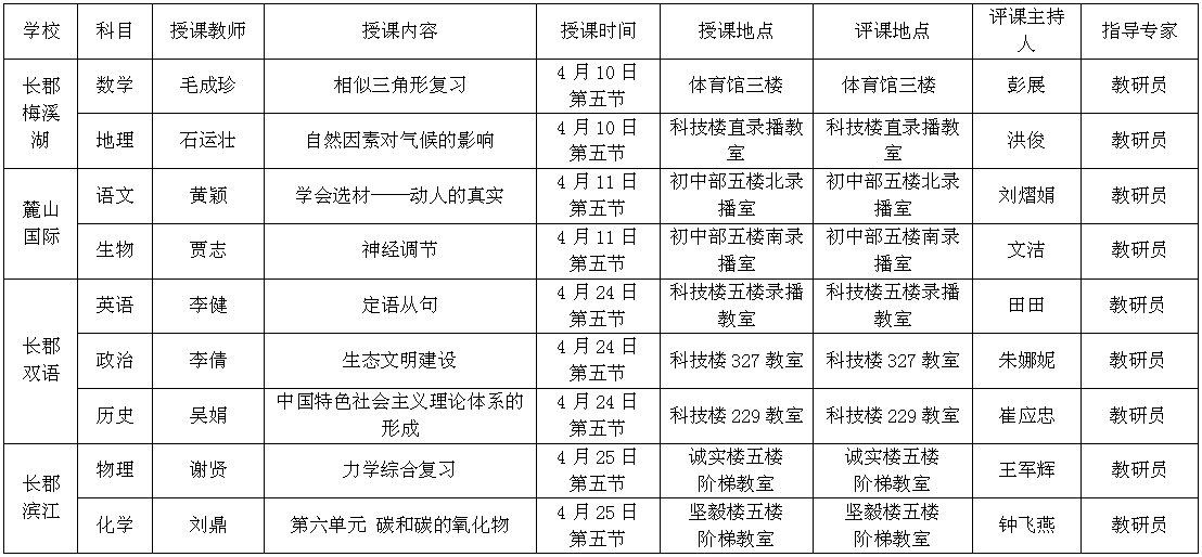 4月24日(第十周星期三)长郡双语实验中学 4月25日(第十周星期四) 长郡滨江中学
