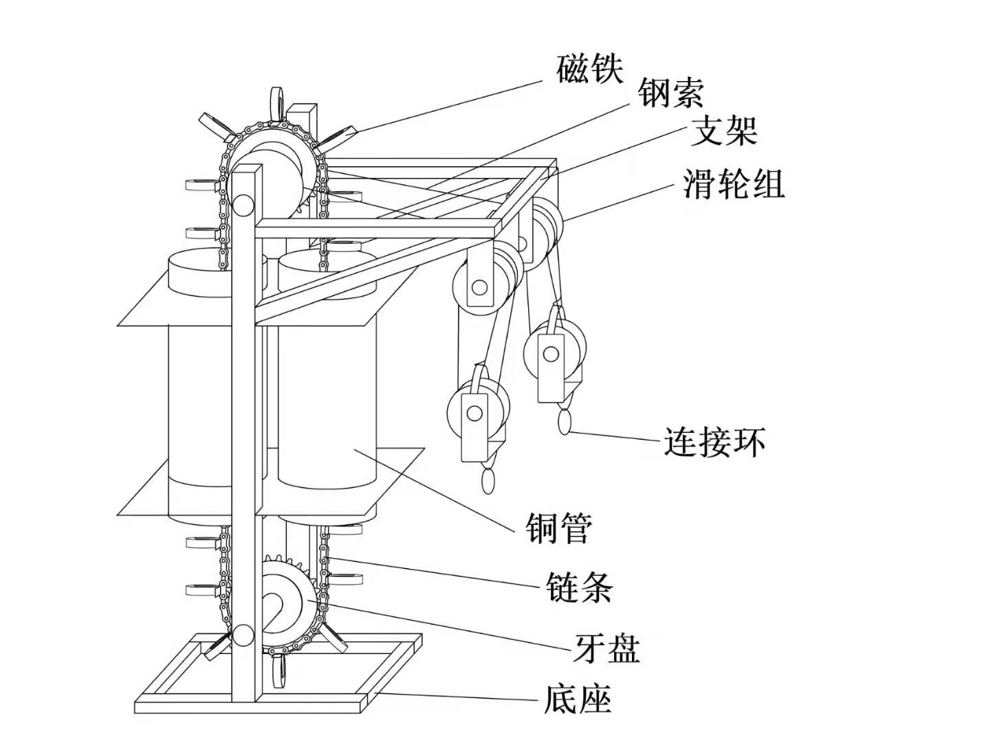 本装置使用直径5厘米,厚2厘米的强力汝磁,按磁极方向相反的方式,相邻磁铁之间的间距为3厘米,安装在链条上,通过两端的链轮,两边分别穿过铜管,构成一个循环式的电磁阻尼装置,配合滑轮组增加3倍承重,并减缓3倍下降的速度,使用35公斤汝磁,最大承载200公斤,降速为0.8米每秒,采用两组交替往复,实现安全高效速降。